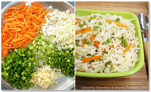 - Rinse rice and pressure cook it with required water till rice grain is seperated. Add a tsp of olive oil and spread out the rice in a plate, keep aside. This makes the rice nonsticky while mixing. Chop the veggies finely lengthwise or cubes.